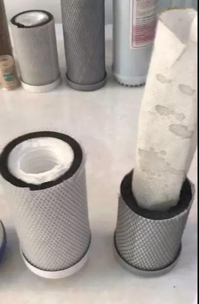 活性炭濾芯包裹的PP棉,左邊是厚實(shí)有料,右邊就一張薄紙一般的過(guò)濾棉