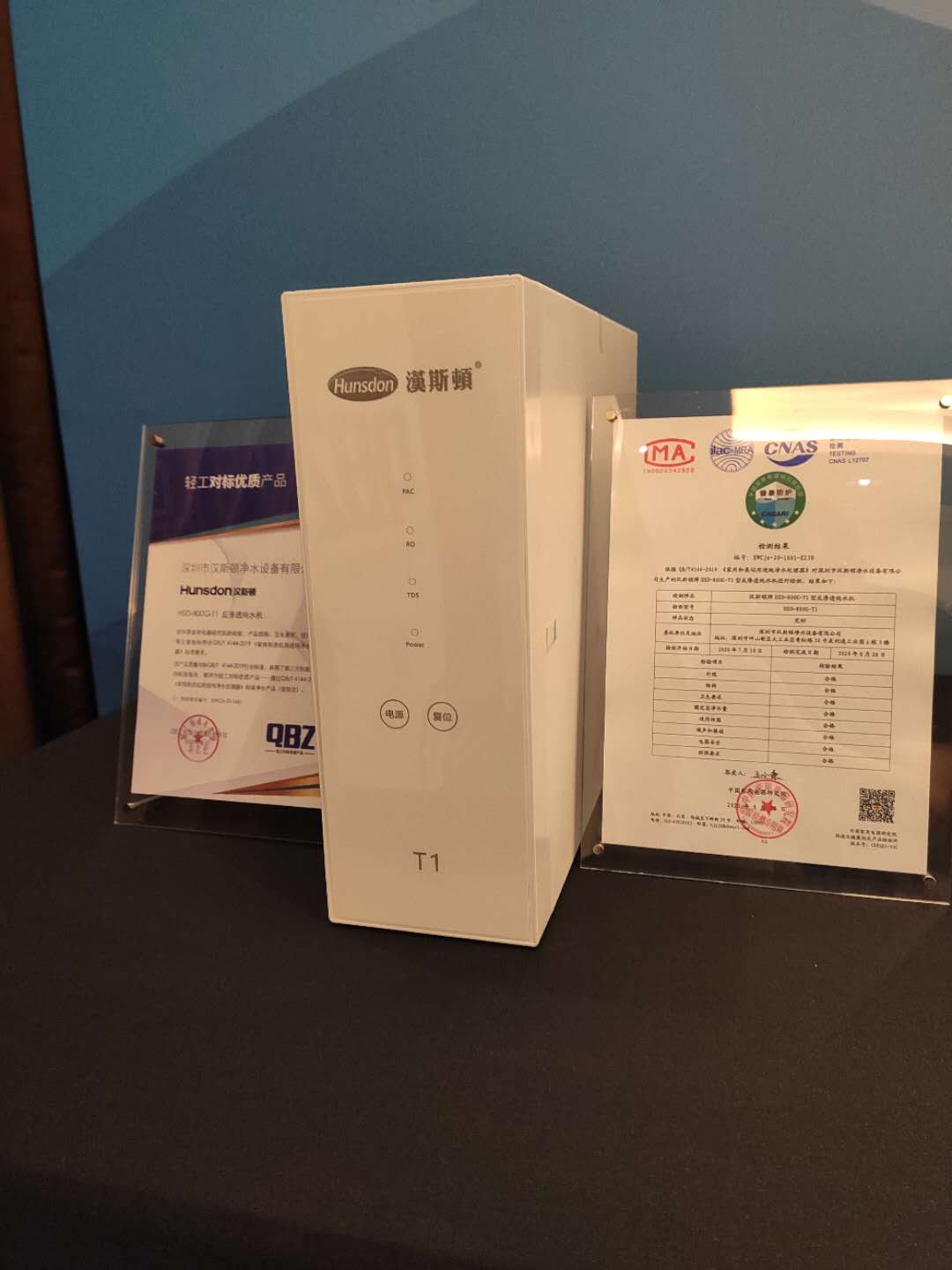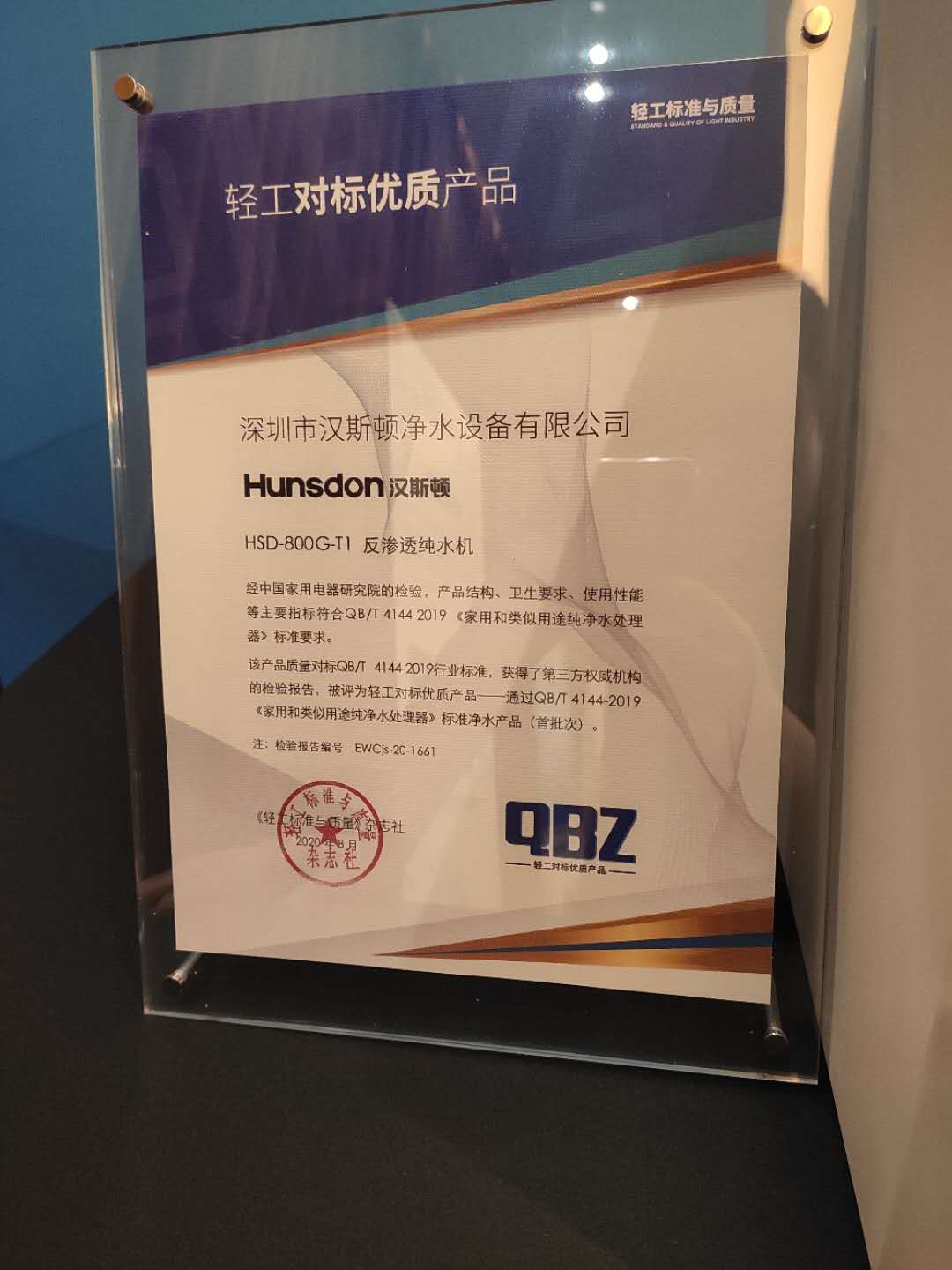 HSD-800G-T1作為漢斯頓集團的新晉熱銷產品,經相關部門檢測后,各項指標均符合新標準,成為首批通過QB/T 4143、QB/T 4144產品標準的凈水器之一,并榮獲本次大會主辦單位頒發的榮譽證書。