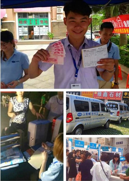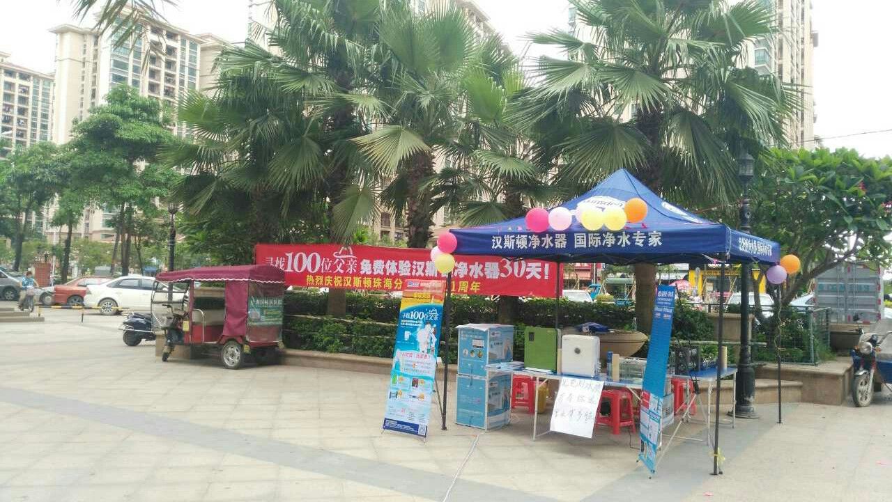 近幾天天氣很好,為此次活動提供了成功的條件,在優(yōu)越的條件下,公司隊員搭建了具有漢斯頓形象的大帳篷,擺上了公司各式各樣的產(chǎn)品,有家用凈水器、軟水機、家用純水機、廚房凈水器,廚飲一體機,RO反滲透機,中央凈水器,直飲凈水器等,其中熱銷產(chǎn)品是家用凈水器和廚房凈水器,也有代表公司形象的高端產(chǎn)品RO反滲透機,還有新研發(fā)產(chǎn)品超濾機也一同展示在終端消費者眼前。同時宣傳漢斯頓公司形象的KT板,擺放明顯,讓社區(qū)消費者一目了然,也受到了消費者的好評。為了有助于銷售,公司還提供了很多可觀的贈品,促進了新顧客對漢斯頓的購買興趣,同時贈送的各式各樣贈品也提高了老顧客的購買量。公司隊員在現(xiàn)場給消費者不斷的介紹漢斯頓產(chǎn)品的特點以及購買建議,使得社區(qū)活動進行的非常熱鬧,吸引更多消費者前來購買。此次社區(qū)活動取得令人滿意的成果不僅有賴于前期領導的指導與活動的策劃。同時具有漢斯頓產(chǎn)品特色的活動現(xiàn)場也離不開現(xiàn)場工作人員的精心設置,現(xiàn)場整體流程井然有序,也為活動打下了基礎,當然活動圓滿的成功,更離不開消費者的大力支持。