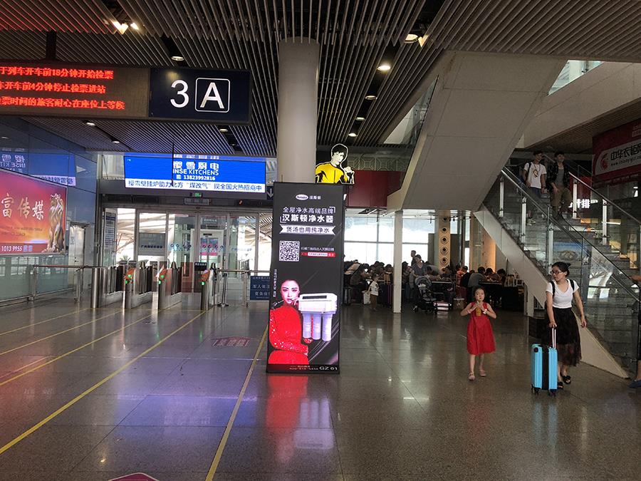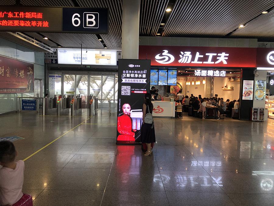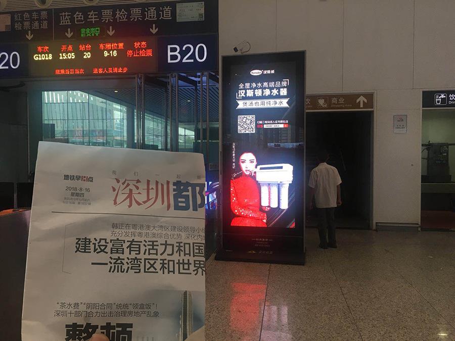 深圳北站、廣州南站是兩大城市的重要交通樞紐,具有人流量大、覆蓋范圍廣、亮相頻率高等特點,也正因為此,漢斯頓以高端廣告牌為載體,布局客流核心區域——以乘客人流走向規劃媒體點位,集中分布于候車大廳、檢票口、安檢區等醒目區域,經過雙面一體LED大屏廣告的投放方式,聚焦推行“全屋凈水高端品牌,漢斯頓凈水器”。