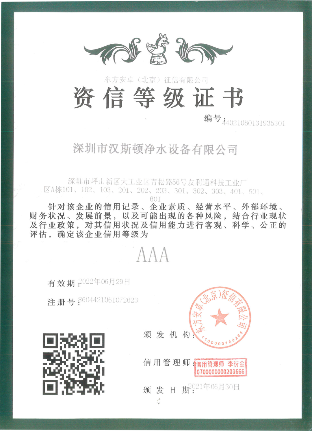 2021年6月,東方安卓(北京)征信有限公司針對(duì)漢斯頓集團(tuán)的信用記錄、發(fā)展前景以及可能出現(xiàn)的各種風(fēng)險(xiǎn),結(jié)合行業(yè)現(xiàn)狀及行業(yè)政策,對(duì)其信用狀況及信用能力進(jìn)行了可觀、科學(xué)、公正的評(píng)估,確認(rèn)漢斯頓集團(tuán)的信用等級(jí)為AAA級(jí)并授予資信等級(jí)證書。